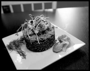 Pour mes amis Christian et Frédéric qui venaient souper hier soir, j’ai décidé de réinventer à ma façon le végélox en le servant sur une salade de lentilles, avec quelques cuillers de fauxmage à la crème et des pousses de daïkon pour donner un peu de relief à tout ça.