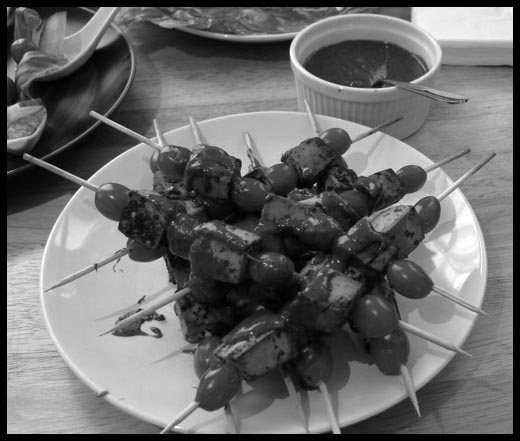 - Alterner les tomates et les cubes de tofu sur des brochettes de bambou.