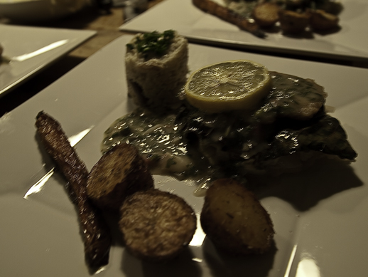 Question d’avoir une assiette un peu plus complète (et de vider un tiroir de frigo), j’ai aussi fait du chou braisé – des minces tranches de chou vert cuites dans l’huile et ensuite dans le vin blanc- et j’ai fait revenir des feuilles de bette à carde. Au moment de monter les assiettes, j’ai d’abord mis un peu de chou braisé, une feuille de bette à carde, les filets de seitan, la sauce par dessus tout ça et une tranche de citron. En accompagnement, j’ai servi un petit risotto de shitake (pour remplacer le fromage, on utilise une crème de cachous) et des légumes grillés à l’érable pour venir couper l’acidité du plat principal. La photo est horrible (c’est la faute au Château Suau qui s’harmonise parfaitement à ce plat) mais le résultat final franchement impressionnant.