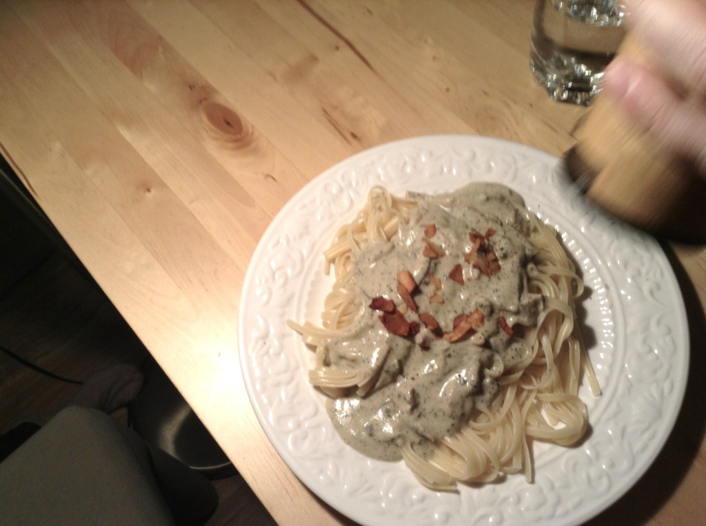 Je l’ai testée avec un peu de persil plat et du bacon de tempeh, c’était excellent. C’est aussi délicieux avec un peu de parmesan de noix. On pourrait l’utiliser dans un bol, sur des légumes cuits au four ou avec un plat un peu sec comme des poivrons farcis. En fait, partout où on mettrait une sauce blanche un peu épaisse. Dommage que sur son site, Le Grand ne propose qu’une recette… avec de la pancetta et du parmesan !