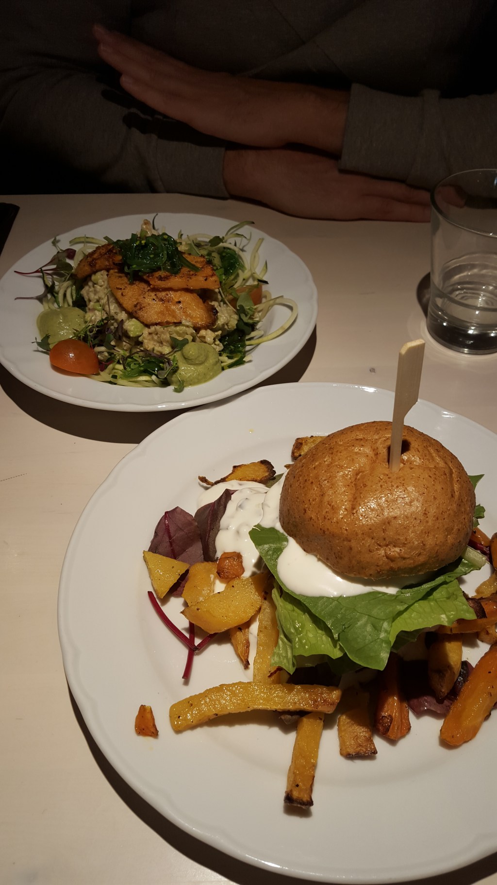 L’heure de la réservation ne pouvait pas arriver assez vite. On était supra excités à l’idée de retourner à cet endroit magique où le véganisme n’était pas la principale raison d’y manger. Parce que pour être honnête, après un repas, on s’en tapait pas mal, que le resto soit végane. Sa principale qualité, au resto, c’était d’être délish. 19h30 sonnèrent enfin : on s’est rués chez V. En entrée, on s’est partagé l’assiette de tartinades sur pain à l’ail (rien à voir avec celui du Pacini, rassurez-vous) et les roulés de concombre à la crème de cachou aux carottes épicées. Encore ici, on s’est dit que les Estoniens n’avaient pas la même définition d’épicé que nous. Ils ne survivraient pas deux secondes au Mexique, les douillets. Simon a ensuite commandé le plat du jour, une merveille de seitan en sauce bien relevée, et moi le burger aux pois chiches et betteraves servi avec légumes. On a accompagné le tout d’une excellente bouteille de vin.