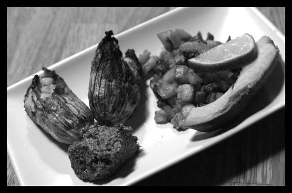 J’ai profité de ma visite à San Francisco en mai dernier pour visiter le restaurant Millenium, probablement le plus grand restaurant végan au monde dont je parle assez souvent ici. J’ai visité le célèbre resto à deux reprises, la dégustation totale à chaque fois, la succession d’épithètes à chaque plat. Mais si je devais en choisir un seul, celui qui m’a le plus marquée, ce serait les «Pumkin Seed Crusted Stuffed Squash Blossom.» Des fleurs de courges farcies avec du tofu citronné à la sauge et servies avec des champignons sautés et de la confiture de groseilles.